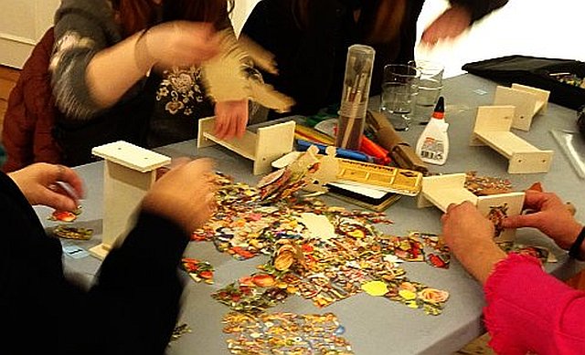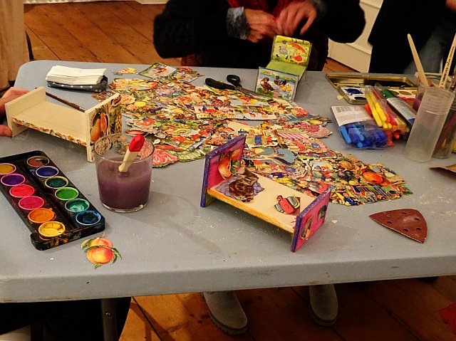 Material: Sperrholzzuschnitt Boden:9x15cm Fußende: 9x7cm Kopfende: 9x9cm jeweils 4 Schräubchen Tuschkästen und kleine Pinsel Glanzbildchen Klebstoff: Ponal Die zugeschnittenen Sperrholzteile werden mit winzigen Schräubchen verschraubt. Das Bettgestell wird farbig gestaltet und mit Glanzbildchen einzigartig dekoriert |