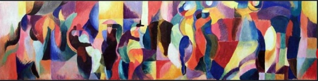 Le Salon des Femmes![]() Sonia Delaunay - Le Bal Bullier - 1913 "The title of this painting when first presented at the Der Sturm gallery in Berlin in 1913 - Mouvement, couleur, profondeur, danse, Bullier (Motion colour, depth, dance, Bullier) - sums up the artist's ambition to transcribe movement with colour-forms. The panoramic format of the canvas unfolds arabesques of dancing couples, swirling about under the halos of the electric lights of the Bal Bullier, a dance hall on the Boulevard Saint-Michel frequented by the Delaunays. The theme of dance, both a means of depicting movement and emblematic of the dynamism of modern life, favours the fragmentation of form and its dissolution into abstract planes." ![]() Orphistisch - eine Hommage à Sonia Delaunay. P.S, Im Jahr 1913 besuchte das französische Künstlerehepaar Robert und Sonia Delaunay regelmäßig den Tanzpalast "Le Bal Bullier", in Paris. Das Paar betrat ihn als „lebendes Kunstwerk“: Beide waren gekleidet in von Sonia Delaunay extra für den Besuch entworfenen Kleidungsstücken im Stil des 1912 von ihnen entwickelten Orphismus; mit dem Simultankontrast von gleichzeitiger Präsentation warmer und kalter Komplementärfarben wurde im Auge des Betrachters durch optische Effekte der Eindruck von Bewegung erzeugt. |