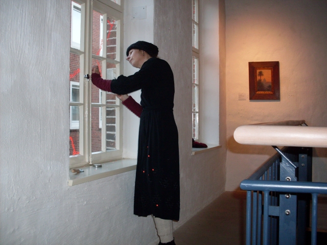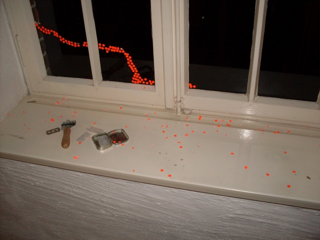 Ich hebe die roten Punkte mit einem Glasschaber behutsam vom Fenster ab und transportiere sie auf mein Kleid.