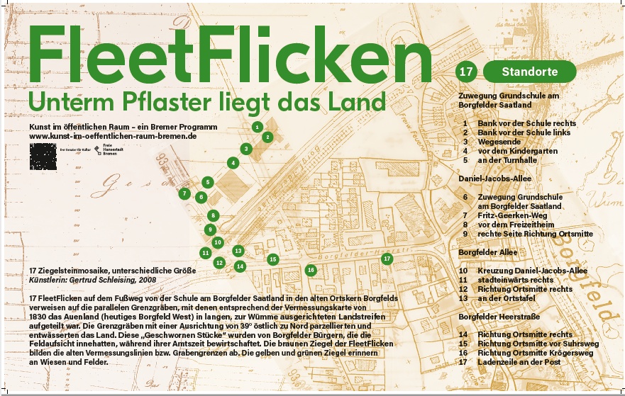 Ziegelsteinmosaike bringen alte Grabengrenzlinien in der Borgfelder Auenlandschaft wieder ans Licht. Jeder der 17 FleetFlicken bildet gradgenau die Vermessungslinien ab,die das Land im 19.Jahrhundert in lange, zur Wümme ausgerichtete Streifen aufteilten.(Nadelabweichung 38° östlich, Maßstab 1:300). In FleetFlicken werden „die Geschwornen Stücke“ mit ihrer parallel verlaufenden Liniatur wieder begehbar.