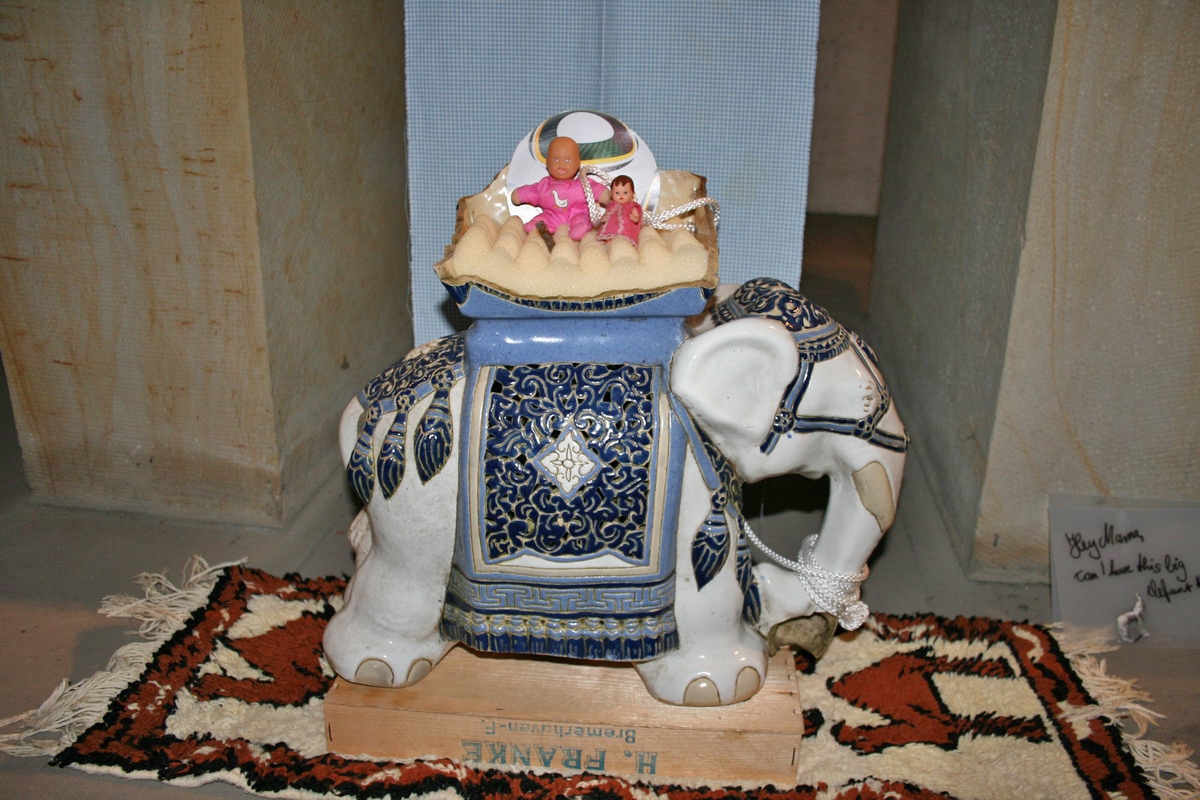Die kleine Tischinstallation wird maßgeblich bestimmt durch Elefantenspielzeuge. Sie rückt die vielerorts vom