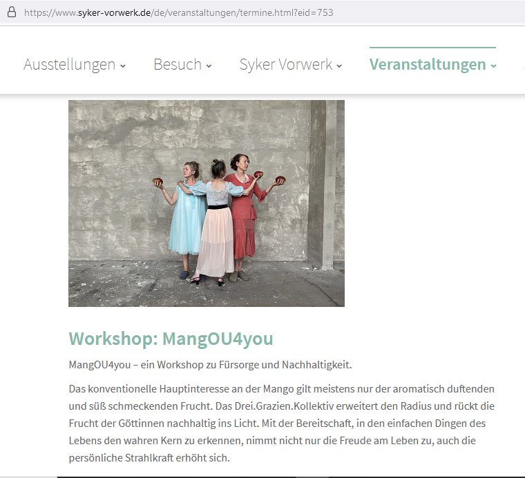 "Der Workshop des Drei.Grazien.Kollektivs thematisiert Fürsorge und Nachhaltigkeit am kunsthistorischen Beispiel der Drei Grazien und der Mango, der Frucht der Göttinnen. Mit der Bereitschaft, in den einfachen Dingen des Lebens den wahren Kern zu erkennen, werden Grundprinzipien für ein glückliches Leben und praktische Möglichkeiten zur Verringerung schädlicher Treibhausgase vermittelt. ![]() Die Veranstaltung klingt mit einem Mango-Imbiss aus. |